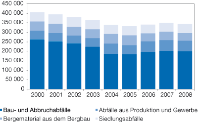 - 1 Das genannte Abfallaufkommen entspricht dem Nettoaufkommen. Nicht berücksichtigt sind die Abfälle aus Abfallbehandlungsanlagen, die erst seit 2006 zusätzlich ausgewiesen werden. Im Jahr 2008 machten sie 38,2 Mio. Tonnen aus.