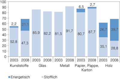 Laut Umweltbundesamt4 sind die Verwertungsquoten für Wertstoffe aus Verpackungen in den letzten Jahren entweder recht konstant geblieben, wie beim Glas, bei Papier, Pappe und Karton sowie bei Holz, oder leicht gestiegen, wie bei Metallen oder bei Kunststoffen. Allerdings zeigt die Abbildung 2 auch, dass die energetische Verwertung von 2003 bis 2008 sowohl beim Kunststoff als auch beim Holz merklich zugenommen hat, während die stoffliche Verwertung zurückgegangen ist.