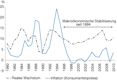 Entsprechend war in China der Festkurs die Grundlage für den Übergang von hoher Inflation und volatilem Wachstum vor 1994 zu niedriger Inflation und stabilem, hohem Wachstum nach 1994 (vgl. Abbildung 1). Zudem wurde China – im Gegensatz zu Japan, das den Yen frei schwanken lässt – zum Stabilitätsanker für ganz Ostasien. So zum Beispiel im Vorfeld und Verlauf der Asienkrise:9 Vor der Krise untergrub die Abwertung des Yen gegenüber dem Dollar die internationale Wettbewerbsfähigkeit der kleinen ostasiatischen Staaten, die wie China den Wechselkurs eng an den Dollar gebunden hielten. Der daraus resultierende Anstieg der Leistungsbilanzdefizite von Thailand, Malaysia, Südkorea, Philippinen und Indonesien führte in die Asienkrise. Im Verlauf der Krise verstärkte die Abwertung des Yen den Abwertungswettlauf in der Region. Hingegen bildete der Yuan einen Stabilitätspol, da die chinesische Regierung der Versuchung widerstand, sich in den Abwertungswettlauf der ostasiatischen Krisenländer einzureihen.