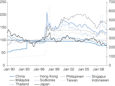 Wechselkursentwicklungen ostasiatischer Währungen gegenüber dem US-Dollar