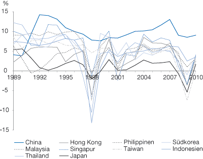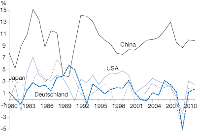 Das Jahr 2010 brachte ein Wechselbad für Deutschlands Konjunkturperspektiven. Wurden im Krisenjahr 2009 noch höhere Wachstumseinbrüche als in den USA, China und vielen europäischen Partnerländern verzeichnet, wandelte sich Deutschland im Verlauf des Jahres 2010 in eine Konjunkturlokomotive. Ein wesentlicher Faktor für die rasche konjunkturelle Erholung war die robuste Nachfrage aus Ostasien, insbesondere aus China, das durch sein nachhaltig hohes Wachstum zur Kernzone der Weltkonjunkturdynamik herangewachsen ist. Die Frage nach den deutschen Konjunkturaussichten für das Jahr 2011 ist damit eng mit den Konjunkturaussichten in China verbunden, wo zwar weiterhin ein hohes Wachstumspotential gesehen wird,1 aber die Sorge hinsichtlich Überhitzung, Inflation und Blasen im Immobiliensektor2 wächst.