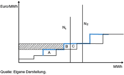Wird – wie durch das Moratorium der Bundesregierung – ein Teil der Atomkraftwerke vom Netz genommen, verschiebt sich die Angebotskurve nach links (blaue Kurve). Bei der Nachfrage N2 erhöhen sich die Kosten zur Deckung dieser Nachfrage um A+B+C, der Preis bleibt jedoch stabil, weil genügend Angebot zu etwa demselben Preis zur Verfügung steht. In diesem Beispiel verringert sich allein die Produzentenrente, also der Gewinn der Stromanbieter. Anders ist dies, wenn die Nachfrage N1 gilt. Hier steigen die Kosten um A und B. Die Ausgaben der Nachfrager steigen aber erheblich, nämlich um die schraffierte Fläche, weil teurere Kraftwerke den Preis bestimmen.