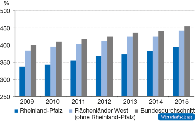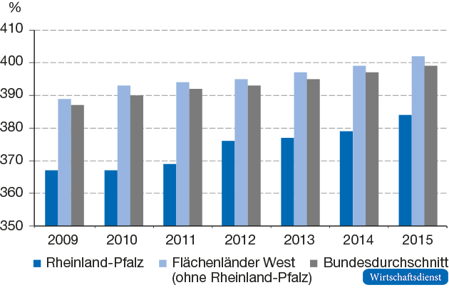 Betrachtet man die Entwicklung des Realsteueraufkommens der rheinland-pfälzischen Städte und Gemeinden, wie dies für die Gewerbesteuer sowie die Grundsteuer (A und B) in Tabelle 1 dargestellt ist, zeigt sich ein Anstieg im Zeitraum von 2009 bis 2015, ohne dass damit jedoch bislang zum Durchschnitt der übrigen Flächenländer aufgeschlossen werden konnte. Das Nettoaufkommen der Gewerbesteuer hat sich im Betrachtungszeitraum erhöht, was in erster Linie auf eine Erholung von den negativen fiskalischen Wirkungen der globalen Wirtschafts- und Finanzkrise zurückgeführt werden kann. Ein ähnliches Bild zeigt sich bei den Einnahmen aus der Grundsteuer B. Auch hier ist das Pro-Kopf-Aufkommen in Rheinland-Pfalz gestiegen. Die Steigerungsrate liegt – anders als bei der Gewerbesteuer – aber nur leicht über dem Wachstum der Grundsteuer-B-Einnahmen der Flächenländer insgesamt. Eine positive Steigerungsrate findet sich auch bei der Grundsteuer A, wobei das Wachstum des Pro-Kopf-Aufkommens hier allerdings auf die „Nachkommastellen“ begrenzt ist. Zugleich lässt sich feststellen, dass die Entwicklung der Einnahmen aus der Grundsteuer A in Rheinland-Pfalz hinter der Gesamtentwicklung der Flächenländer zurückgeblieben ist.