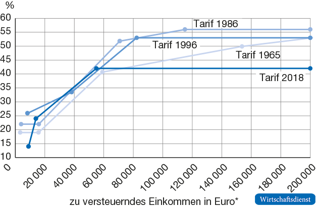 Seit dem Jahr 1958 wird die Einkommensteuer in der bis heute geltenden Form in Deutschland nach einer mehrstufigen Tarifformel errechnet.3 Von Beginn an ist der Tarifverlauf dabei progressiv ausgestaltet. Dies bedeutet, dass der Grenzsteuersatz, also die Steuerbelastung je zusätzlich erwirtschaftetem Euro, mit dem Einkommen steigt, bis der maximale Satz erreicht ist. Damit wird dem Prinzip der Besteuerung nach Leistungsfähigkeit Rechnung getragen, das sich aus dem Gleichheitsgrundsatz in Artikel 3 des Grundgesetzes ergibt. Jeder Steuerpflichtige soll gemäß seiner wirtschaftlichen Möglichkeiten zur Finanzierung des Gemeinwesens beitragen.4