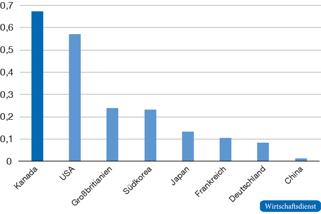 Kanada kann aufgrund seiner geringen Einwohnerzahl und wesentlich kleineren Volkswirtschaft kaum so hohe absolute Weltklassepatentzahlen verbuchen wie die USA. In Relation zu seiner Bevölkerungsstärke ist Kanada aber in einzelnen Bereichen, insbesondere bei der Digitalisierung, sehr stark. So weist Kanada z. B. die meisten Weltklassepatente pro 1 Million Einwohner in der Technologie Quantencomputing auf (vgl. Abbildung 5).
