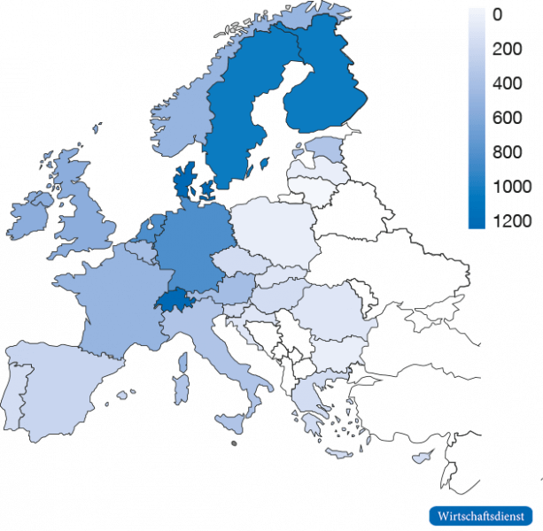 Europa ist insgesamt, gemessen an seinem Output an Weltklassepatenten in Zukunftstechnologien, eine sehr heterogene Forschungslandschaft. Normiert auf die Patente pro 1 Million Einwohner ist die Schweiz deutlich führend. In Süd- und Osteuropa ist die Forschungsaktivität hingegen deutlich geringer als in Nord- und Westeuropa (vgl. Abbildung 9).