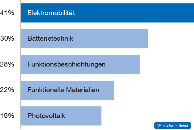 Japan verzeichnet dagegen – anders als China und Südkorea – einen langsamen Abstieg auf hohem Niveau. Im Jahr 2000 befand sich Japan noch in 49 Technologien unter den drei Ländern mit den meisten Weltklassepatenten, 2019 sind es nur noch 38. Als stärkste Technologie Japans ist ganz klar die Elektromobilität hervorzuheben. Hier ist Japans Anteil an Weltklassepatenten im internationalen Vergleich mit 41 % am höchsten (vgl. Abbildung 3).