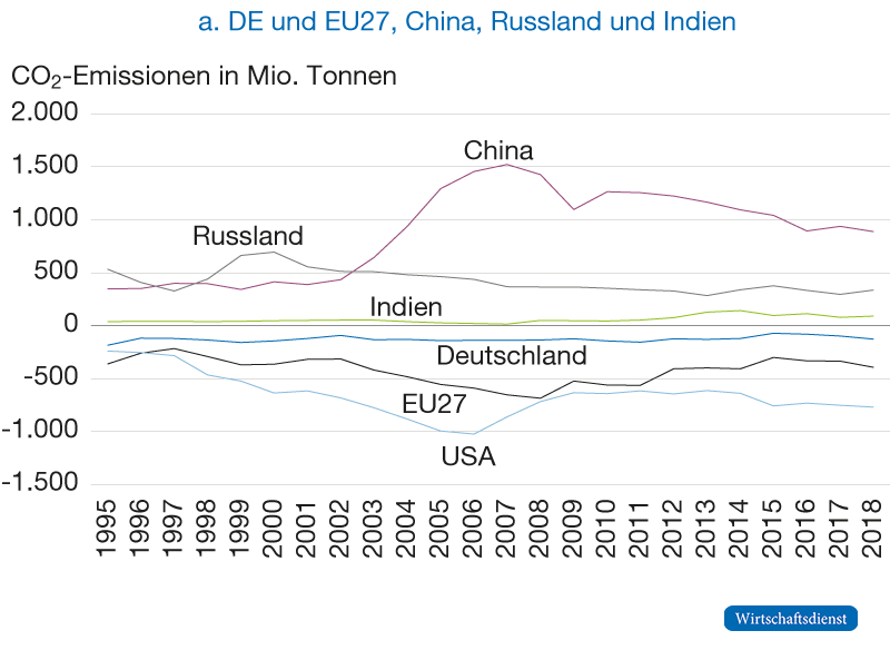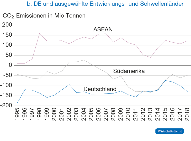 Abbildung 2 zeigt die CO2-Nettoexporte für ausgewählte Länder über die Zeit.4 Indien, Russland und China sind CO2-Nettoexporteure, während Deutschland, die EU-27 und USA Nettoimporteure sind. Insbesondere ist aber der Vergleich zu Entwicklungs- und Schwellenländer interessant, wobei leider nicht für alle Staaten Daten vorliegen. Abbildung 2b zeigt, dass die Nettoexporte der ASEAN-Staaten5 trotz ähnlich großem BIP deutlich CO2-intensiver sind als die Südamerikas. Die ASEAN-Staaten sind während des gesamten Zeitraums CO2-Nettoexporteure, während südamerikanische Länder CO2-Nettoimporteure sind. Leider liegen für den afrikanischen Kontinent keine vergleichbar umfassenden Daten vor. Deutschland importiert CO2-intensive Güter vor allem aus Russland und China. Während deutsche CO2-Importe aus Russland, China und Nicht-OECD-Ländern über die Zeit deutlich gesunken sind, sind die CO2-Importe aus OECD-Ländern in geringerem Tempo zurückgegangen (OECD TeCO2, 2021, eigene Berechnungen). Dies spiegelt partiell den stärkeren Rückgang der CO2-Intensität der Produktion in Russland und China im Vergleich zur OECD wider (OECD, 2021).