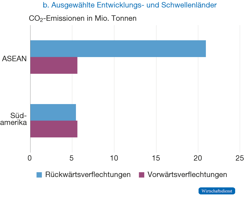 Auch wenn ein großer Anteil der deutschen Importe aus Südamerika und insbesondere aus MERCOSUR-Mitgliedstaaten auf Landwirtschaft und Mineralien entfallen, sind die CO2-Emissionen der Rückwärtsverflechtungen im Verhältnis relativ gering. Allerdings ist es wichtig zu betonen, dass die südamerikanischen Länder im Vergleich zu ASEAN-Mitgliedstaaten insgesamt einen deutlich geringeren Integrationsgrad in globale Wertschöpfungsketten aufweisen.10