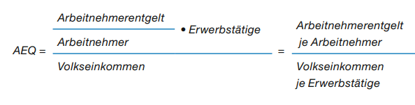 Dieser Ausdruck verdeutlicht, dass die AEQ fällt, wenn das Volkseinkommen je Erwerbstätigen schneller steigt als das durchschnittliche Arbeitnehmerentgelt und umgekehrt. Eine sinkende AEQ signalisiert, wie später gezeigt wird, damit auch eine Lohnzurückhaltung, da die Arbeitnehmereinkommen hinter dem Produktivitätszuwachs zurückbleiben; die Arbeitnehmer werden dann nicht entsprechend ihrem Zuwachs an Leistungsfähigkeit entlohnt.