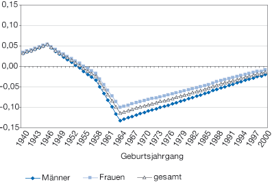 - 18 Genaugenommen unterscheidet sich der Rentenerhöhungseffekt zwischen Männern und Frauen eines Jahrgangs etwas. Zur Vereinfachung wurde aber für jeden Jahrgang eine einheitliche Rentenerhöhungsrate angenommen. Siehe Fußnote 17.