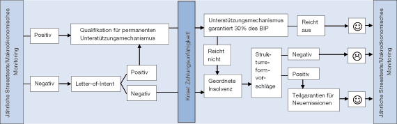 In der Abbildung 1 wird ein möglicher Krisenmechanismus dargestellt. Ausgangspunkt sind jährliche nationale Stresstests aufbauend auf einem makroökonomischen Monitoring. Lassen sich in den Stresstests keine fundamental begründeten Risiken erkennen, dann qualifiziert sich das Land automatisch für einen permanenten Unterstützungsmechanismus, der im Bedarfsfall Garantien oder Kredite bereitstellt. Treten bei einem nationalen Stresstest allerdings bedeutende Risiken zu Tage, dann wird das Land aufgefordert, in einem Letter-of-Intent Reformvorschläge zu unterbreiten. Werden diese als ausreichend bewertet, dann qualifiziert sich das Land ebenfalls für den permanenten Unterstützungsmechanismus. Sollten die Reformvorschläge als nicht geeignet zur Begrenzung der Risiken bewertet werden, dann wird das Land aus dem Mechanismus ausgeschlossen. Da auch im Falle einer Unterstützungsgarantie Krisen nicht gänzlich ausgeschlossen werden können, ist es den Ländern demnach mit oder ohne Unterstützungsgarantie möglich, einer Zahlungsunfähigkeitskrise zu begegnen. Qualifizierte Länder würden in einem solchen Fall den Unterstützungsmechanismus in Anspruch nehmen. Dieser sollte ausreichen, um Marktübertreibungen wirksam abzufedern. Nur im theoretischen Fall, dass das Volumen nicht ausreicht, muss für das Land ein geordnetes Insolvenzverfahren durchgeführt werden. Länder, die ohne Qualifikation für den permanenten Unterstützungsmechanismus zahlungsunfähig werden, durchlaufen direkt ein Insolvenzverfahren. Gelingt es dem Land, im Zuge der Insolvenz Strukturreformen zu planen, die geeignet sind, langfristig neue Schuldenprobleme zu vermeiden, dann kann das Land solidarische Hilfen zur Wiederherstellung des Zugangs zu den internationalen Kapitalmärkten in Form von Garantien in Anspruch nehmen. Verbessert sich die Risikolage dadurch, dann kann sich das Land wieder für den Unterstützungsmechanismus qualifizieren, anderenfalls ist bei erneuter Zahlungsunfähigkeit wieder unmittelbar ein Insolvenzverfahren einzuleiten.