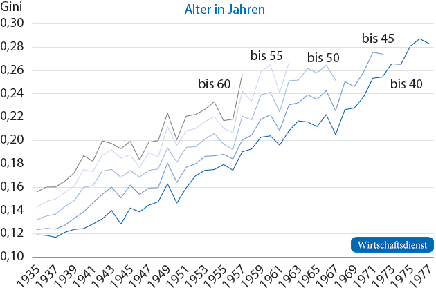 Für die Jahrgänge 1935 bis 1957 kann die Ungleichheit der Lebenseinkommen nahezu über das gesamte Erwerbsleben – vom Alter 20 bis 60 – gemessen werden. Hier ist ein klarer Aufwärtstrend des Gini-Koeffizienten von 0,16 auf 0,24 zu erkennen. Dennoch sind die Lebenseinkommen wesentlich gleicher verteilt als die durchschnittlichen Jahreseinkommen; für die betrachteten Jahrgänge ist die Ungleichheit der Lebenseinkommen um ein Drittel geringer (Bönke et al., 2015)