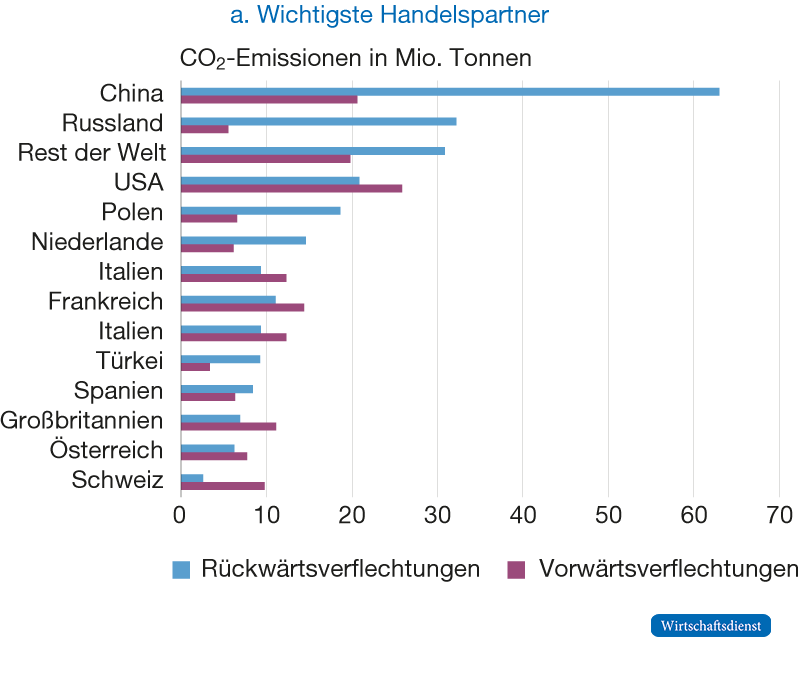 Um die potenziellen Auswirkungen von CO2-Steuern oder Grenzsteuerausgleichsmaßnahmen auf andere Länder komplett zu erfassen, ist ein Blick auf die direkten Ex- und Importe von CO2 allerdings nicht ausreichend. Vorwärts- und Rückwärtsverflechtungen von Wertschöpfungsketten in Verbindung mit den enthaltenen CO2-Emissionen ergeben ein wesentlich umfassenderes Bild. Vorwärtsverflechtungen umfassen dabei CO2-Emissionen eines Landes, die in im Ausland nachgefragten Endprodukten enthalten sind. Rückwärtsverflechtungen enthalten die ausländischen CO2-Emissionen, die in der inländischen Endnachfrage enthalten sind. Der derzeit vorliegende Vorschlag der EU-Kommission zum Grenzsteuerausgleich umfasst allerdings bisher nur einen Teil der Rückwärtsverflechtungen.6